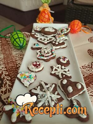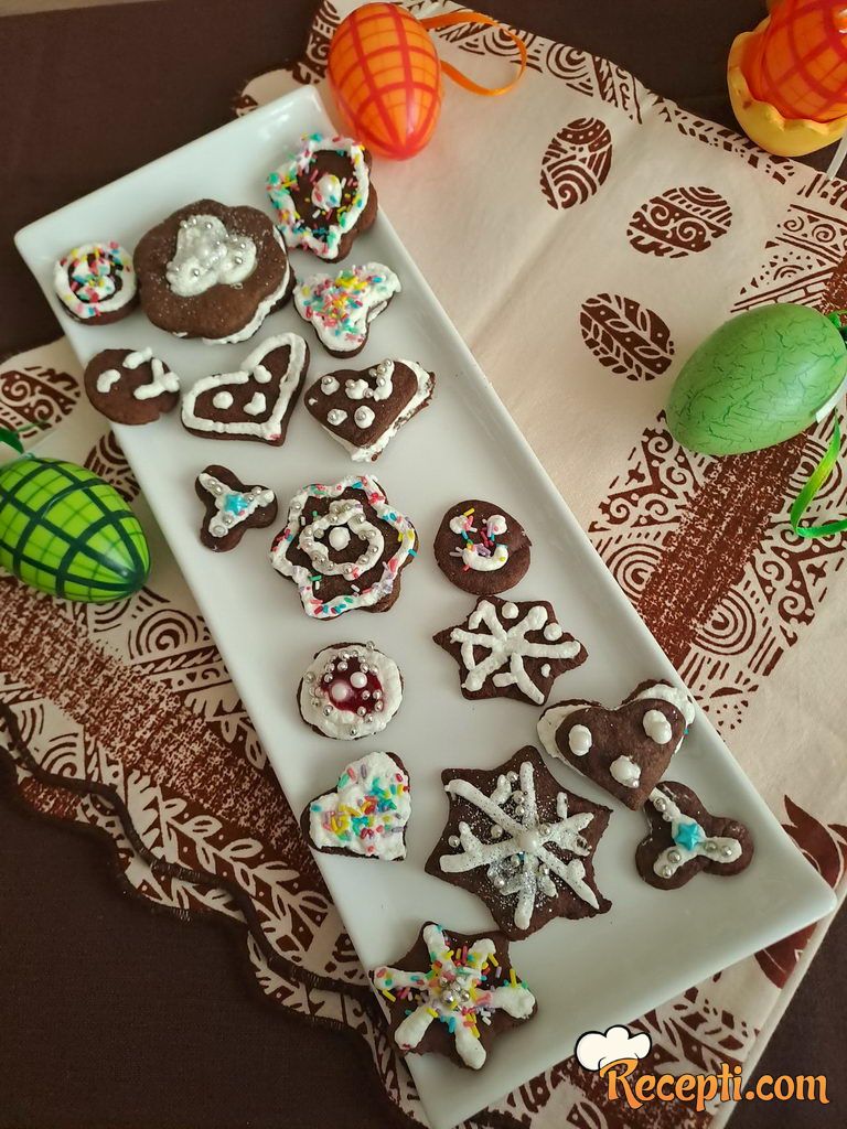 Testo rastanjiti na debljinu 3 mm, pa raznim modlicama vaditi oblike i ređati u pleh na pek papir. Peći 5-6 minuta na 175 stepeni.
