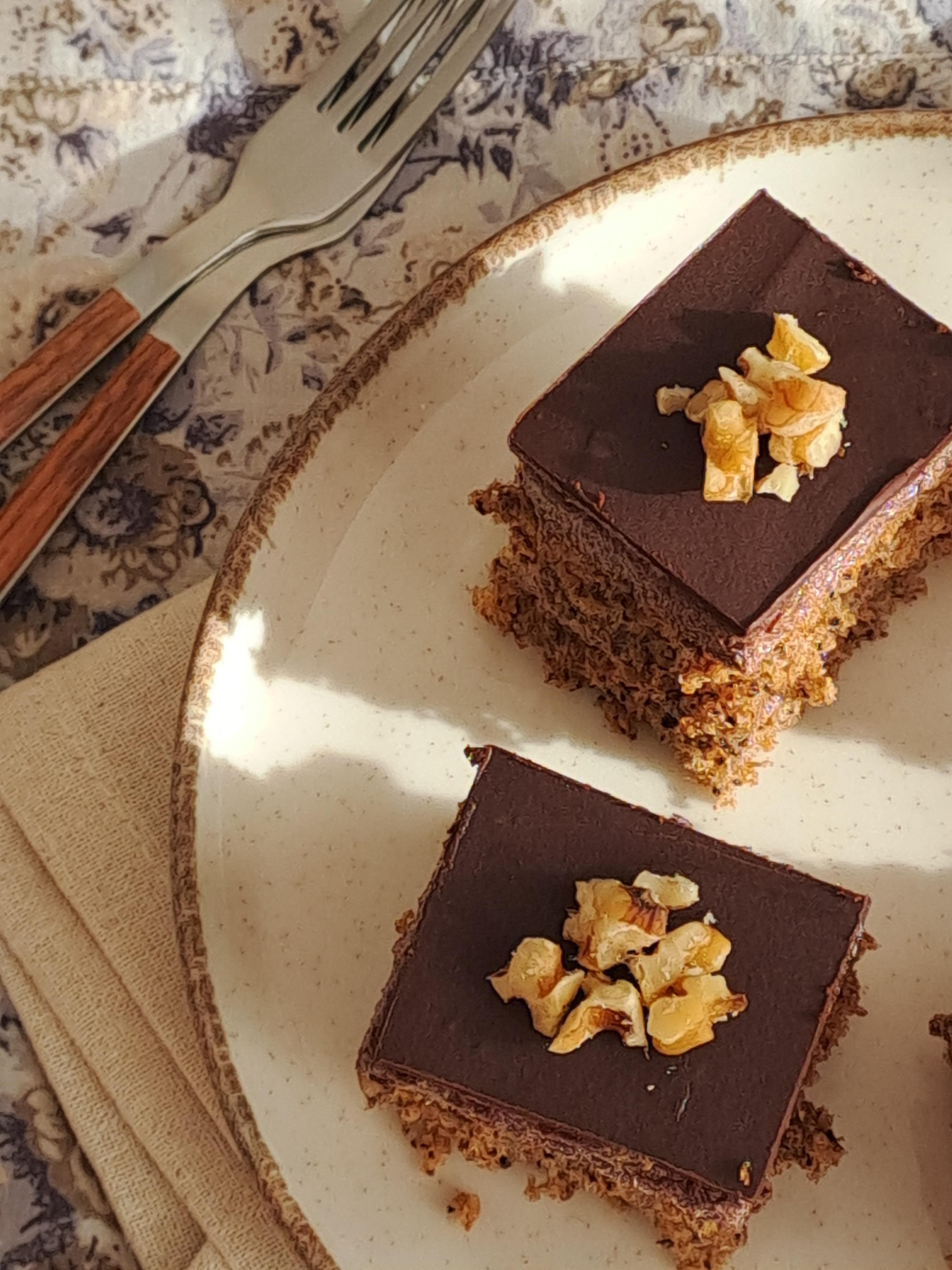 Izmešati orahe, brašno i prašak za pecivo, pa dodati u umućena jaja. Dodati i kafu, sve dobro sjediniti i preručiti u pleh dimenzija 34x24 cm obložen pek papirom. Poravnati koru i peći 25 minuta na 175 stepeni.