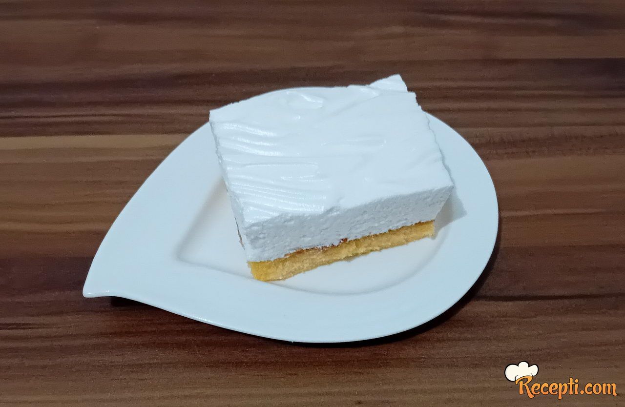 Beli deo: Sjediniti belanca, šećer, limunov sok, vanilin šećer, blago izmešati ručnom žicom te zagrejati na pari 10 minuta, uz mešanje. Zatim skloniti sa vatre i mikserom umutiti u čvrst sneg te naneti preko biskvita.
