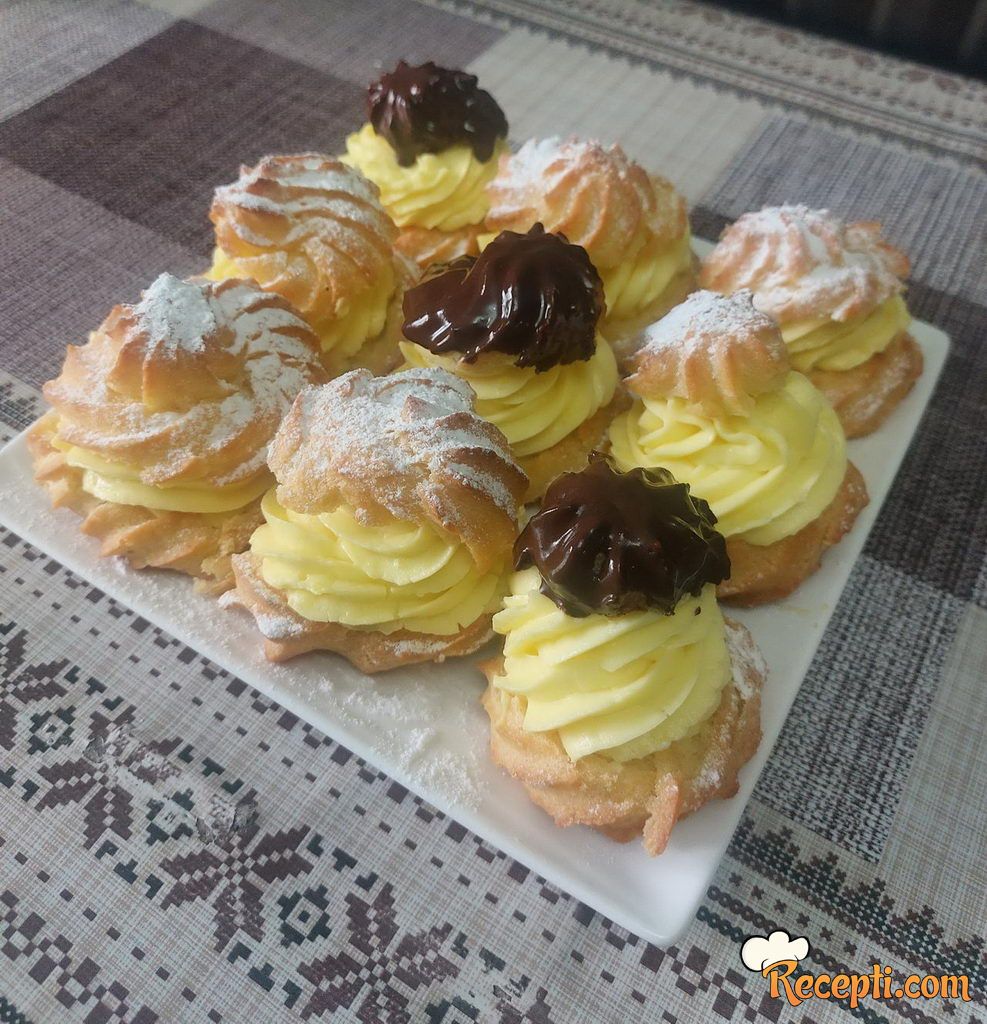 Krofnice: U posudu sipati vodu i ulje i ostaviti da provri, zatim skloniti na tihu vatru i dodati brašno. Kuvati ga na tihoj vatri par minuta. Ohladiti par minuta pa dodavati jedno po jedno jaje uz neprekidno mućenje mikserom. Gotovo testo napuniti u dresing kesu i na pleh obložen pek papirom praviti oblike. Ispečene krofnice izvaditi iz rerne i obavezno pokriti krpom dok se ne ohlade. Ohlađene krofnice iseći na pola i filovati filom iz dresing kese tako da dobijete željeni oblik. Preko fila poklopiti kapicom. Po želji dekorisati.