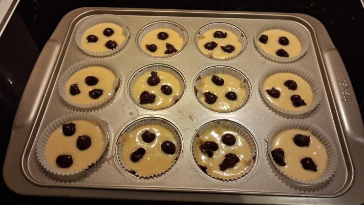Dodati mešavinu za mafine iz pakovanja, i sve dobro umutiti. Sipati u kalup za mafine u koji ste prethodno stavili papirnate kapice. Masu rasporediti ravnomerno u svih 12 kapica. Od višanja odvojiti 12 komada za dekoraciju, a ostale zabadati u testo.