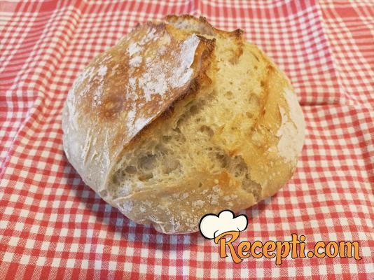 Rernu uključiti da se zagreje na 220 stepeni. Staviti hleb da se peče 40 minuta. Zatim izvaditi šerpu, skloniti poklopac i vratiti ponovo šerpu u rernu da površina hleba porumeni. Pečeni hleb prebaciti na rešetku za hleb da se prohladi pre sečenja.
