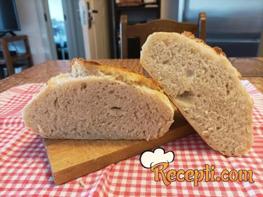U vanglicu staviti brašno, dodati so i suvi kvasac, pa promešati. Sipati, postepeno, toplu vodu i varjačom dobro sjediniti testo. Pošto je testo dosta lepljivo, drvenom varjačom ga "ulupati" dobro, oko 2 minuta (kao kada žicom za mućenje mutite testo). Prekriti vanglicu providnom folijom i ostaviti ga na toplom mestu 30 minuta. Posle 30 minuta ga ponovo varjačom dobro izmešati i ostaviti još 30 minuta da odmori. Zatim ga još jedanput dobro izmešati, prekriti vanglicu providnom folijom i kuhinjskom krpom i ostaviti na sobnoj temperaturi 2 sata, pa vanglicu prebaciti u frižider i ostaviti da odstoji preko noći.