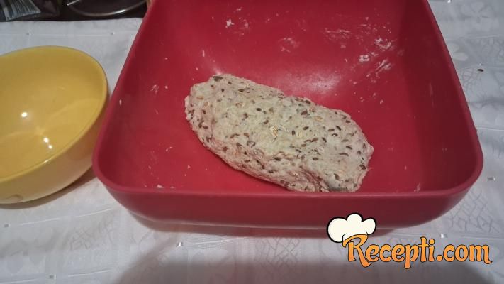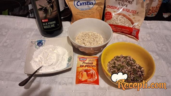 U veću činiju presuti pahuljice i dodati sve ostale sastojke i zamesiti testo.