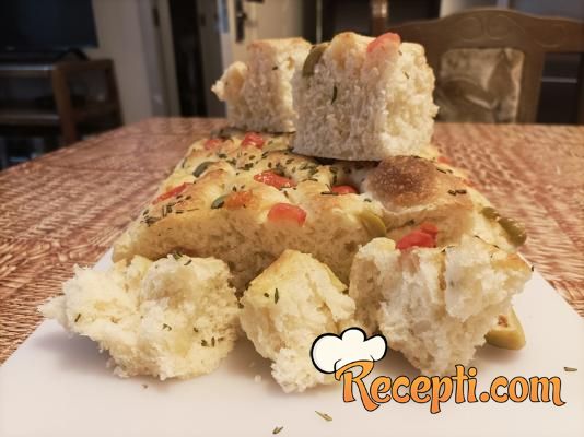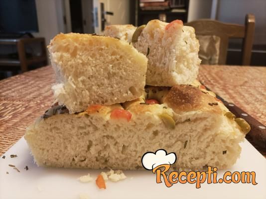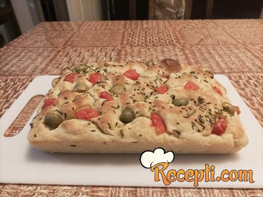 Rernu zagrejati na 200 stepeni. Kada je pogača narasla, dobro je preliti maslinovom uljem i prstima napraviti udubljenja. U udubljenja staviti iseckane masline i čeri paradajz. Posuti ruzmarinom, belim lukom u prahu i morskom solju. Staviti da se peče oko 20-30 minuta.
