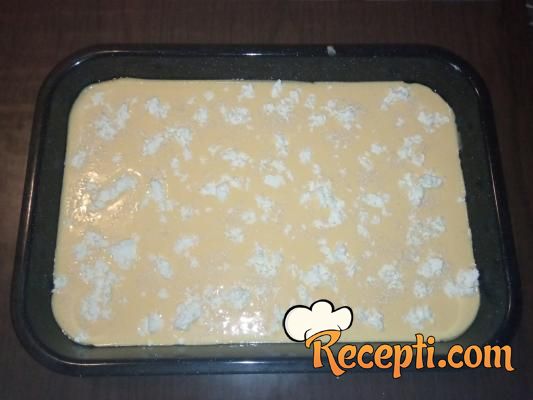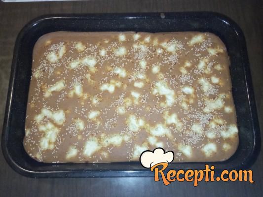 Kad se pleh ugreje, sipati smesu i svuda ravnomerno rasporediti sir i susam. Vratiti da se peče oko 30 minuta.