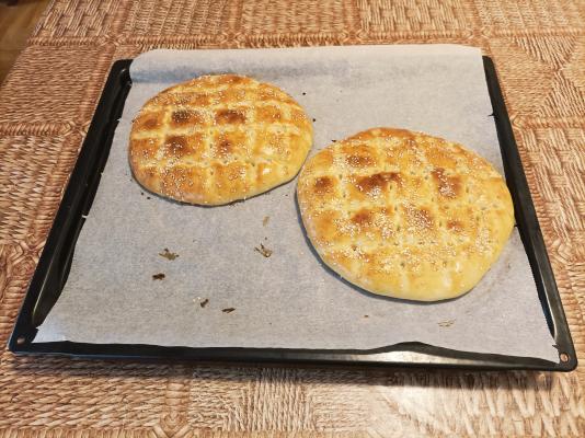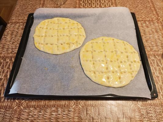 Veliki pleh od električnog šporeta obložiti pek papirom i ostaviti ga na stranu. Naraslo testo prebaciti na radnu podlogu (ne stavljati brašno) blago ga premesiti i podeliti na dva jednaka dela. Od svakog dela oblikovati lopticu testa. Uzeti prvu lopticu i prstima je, pritiskajući, raširiti u krug debljine oko 1 cm. Prebaciti lepinju u pleh. Isto uraditi i sa drugom lopticom testa.