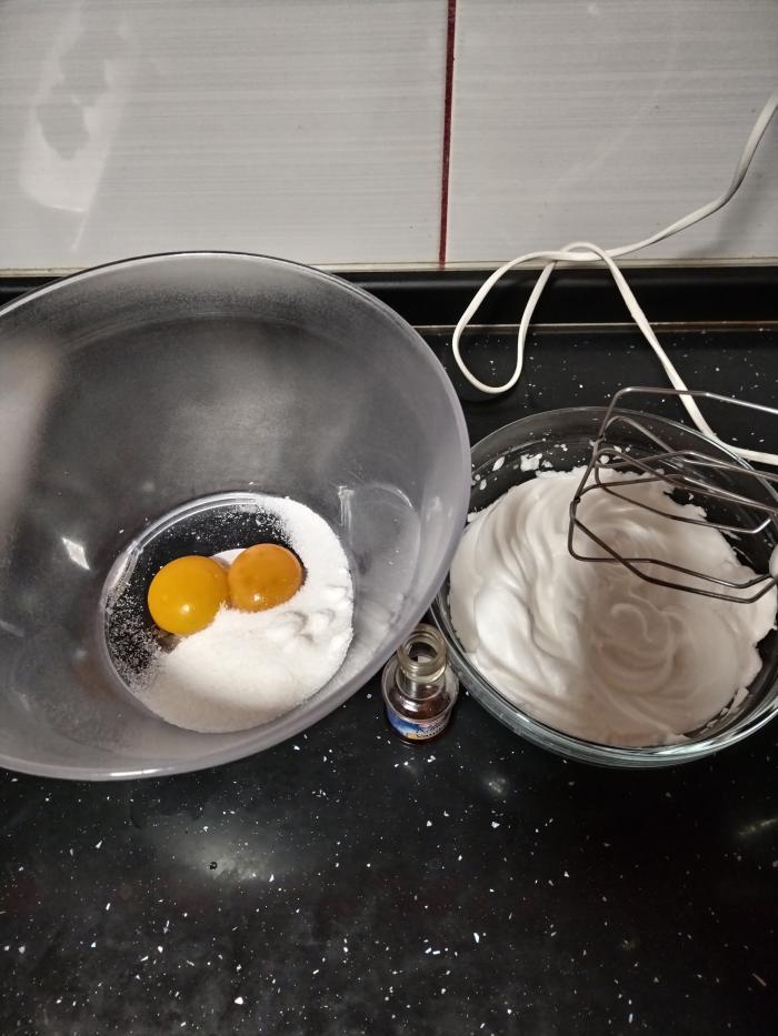 Prvo belanca umutite u čvrst šne i ostavite sa strane. Potom žumanca umutite sa šećerom i vanilin šećerom, pa dodajte kašičicu arome vanile.