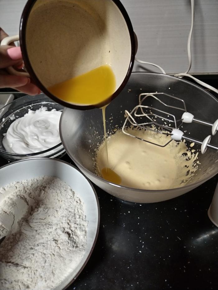 Na kraju smesi sa žumancima dodajte umućena belanca i lagano ih kružnim pokretima promešajte sa ostatkom smese žicom za mućenje.