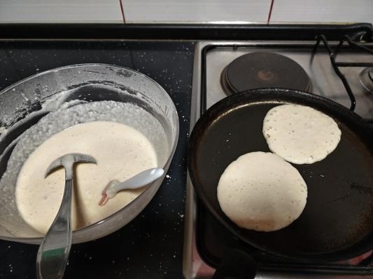 Tiganj zagrejte, pa temperaturu smanjite duplo i tako ih pecite. Ja stavim kap ulja samo pre izlivanja smese za prvu palačinku. Sipa se smesa na topao tiganj, sačeka se pojava mehurića po površini palačinke i to je momenat kada se okreće na drugu stranu. Jako je važno da se peku na niskoj temperaturi, jer tako neće pregoreti niti će ostati žive unutra.