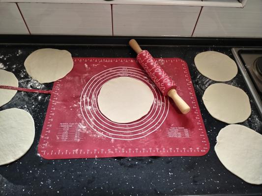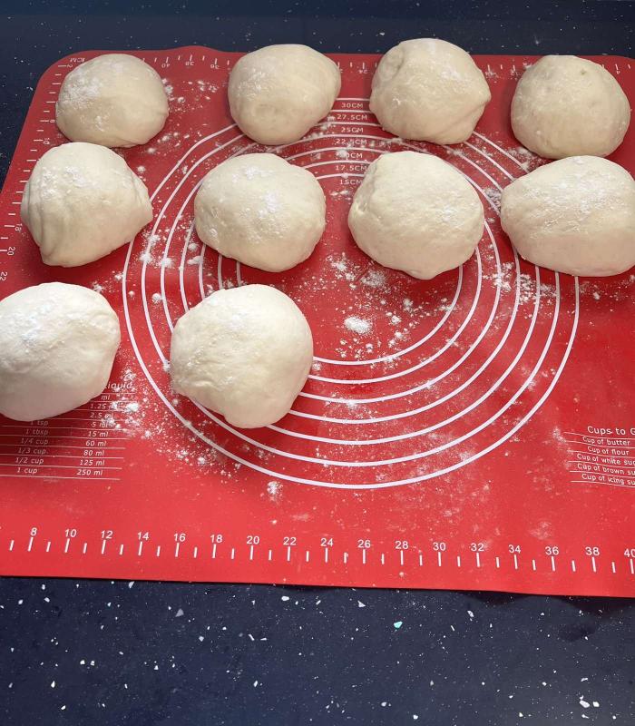 Na radnu površinu stavite nadošlo testo i podelite ga na 10 delova. Svaki deo formirajte u loptu, pospite sa brašnom i ostavite 20 minuta da odstoji.