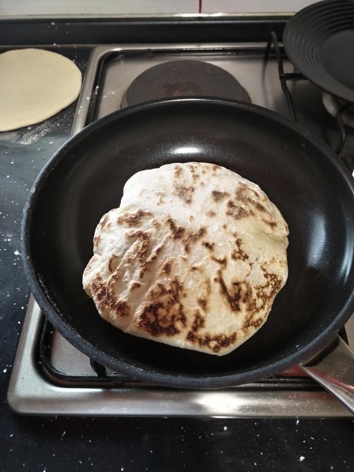 Tiganj zagrejte na najjačoj temperaturi i stavite lepinju. Pecite oko 30 sekundi sa jedne strane, pa čim mehurići počnu da se pojavljuju na testu, okrenite na drugu stranu, pa posle 30 sekundi opet okrenite na drugu stranu. Pustite da se od lepinje napravi balon, pa opet okrenite da se zapeče i druga strana. Pečenje lepinje dok su još tople premažite puterom i po želji pospite svežim peršunom.