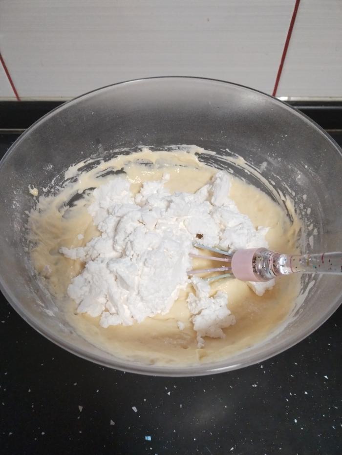Zatim dodajte brašno koje ste prethodno sjedinili sa praškom za pecivo i kukuruznim brašnom. Na kraju sir usitnite viljuškom i pomešajte sa kajmakom pa lagano sjedinite sa prethodnom smesom.