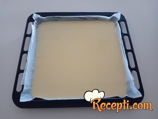 Jaje i mleko sjediniti ručnom žicom za mućenje, dodati so i izmešati. Dodati brašno i izmešati ručnom žicom da nema grudvica. Pleh od električnog šporeta obložiti pek-papirom i usuti pripremljenu smesu.