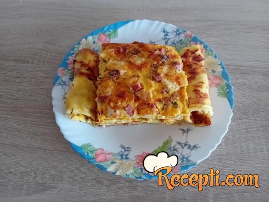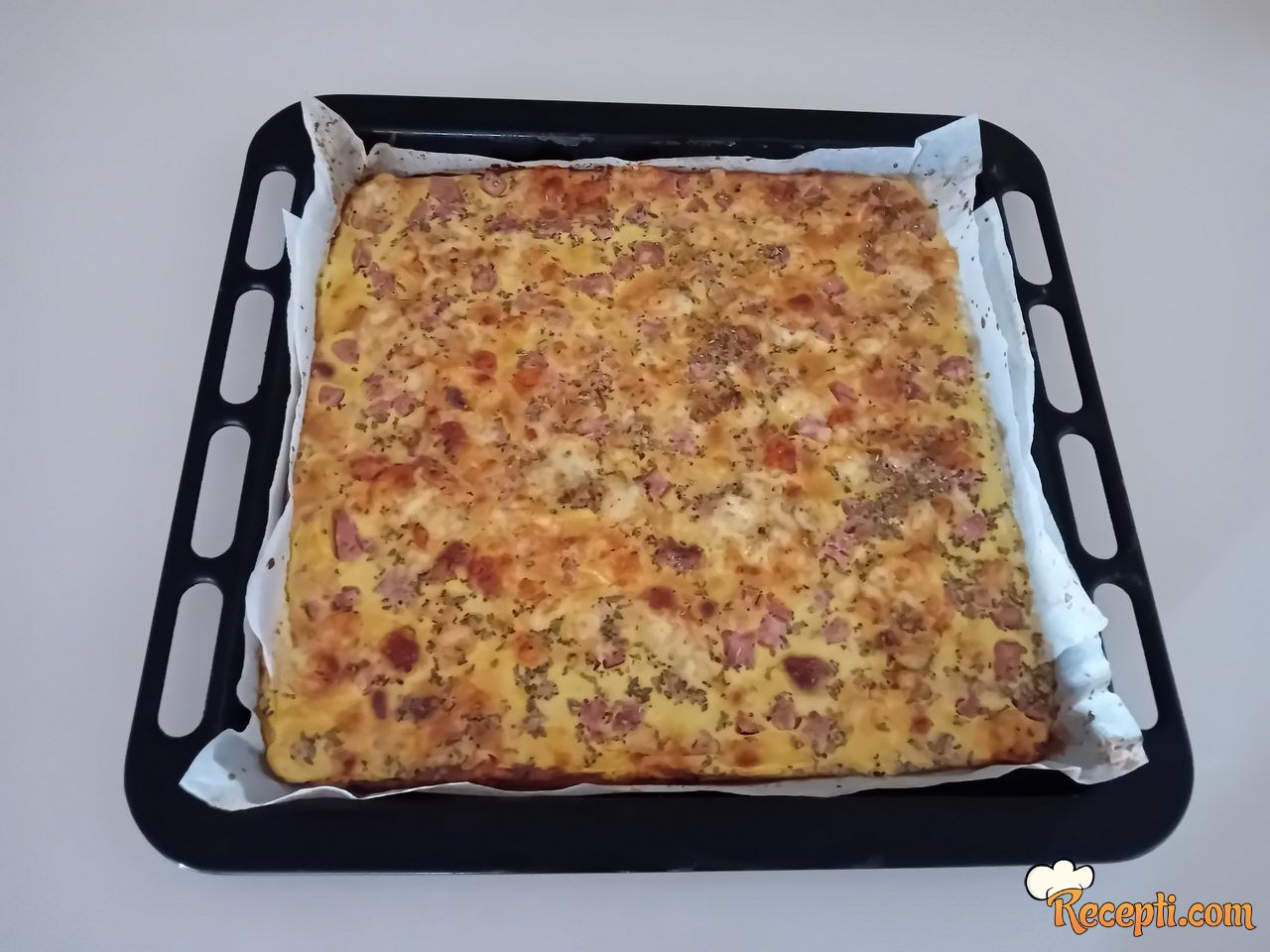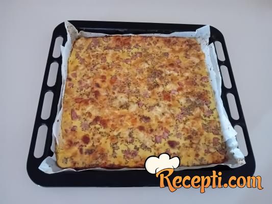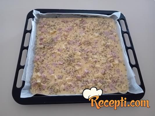 Preko smese rasporediti seckanu šunku, zatim naneti rendani kačkavalj i na kraju posuti origanom. Peći u dobro zagrejanoj rerni na 180 stepeni 25-30 minuta.