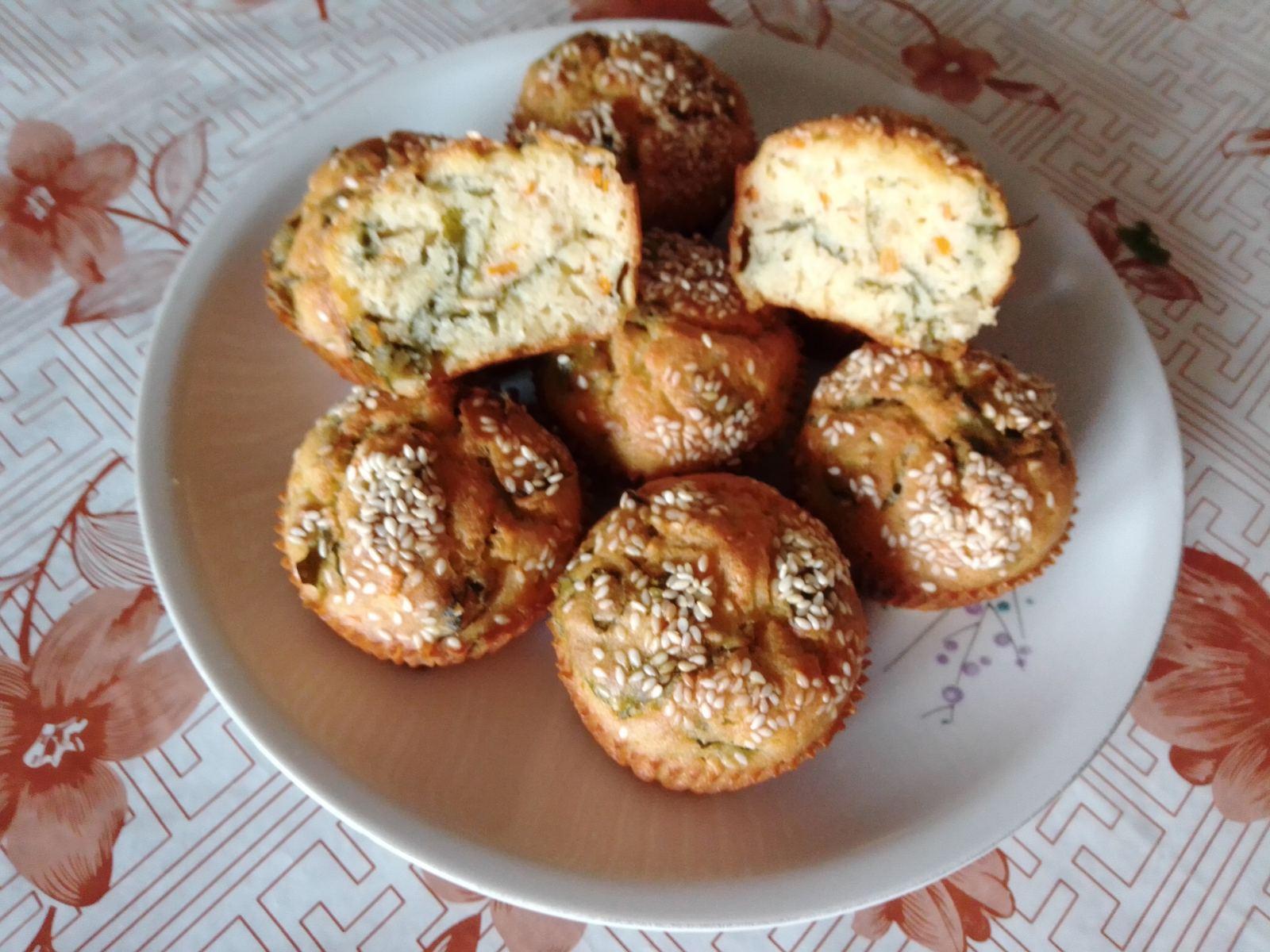 Umutiti jaja, dodati ulje, vodu, jogurt, so, pahuljice, kukuruzno i belo brašno, prašak za pecivo izmešati i na kraju dodati spanać i šargarepu izmešati i sipati u papirne korpice stavljene u kalup za mafine. Posuti susamom i peći 30 minuta na 200 stepeni.