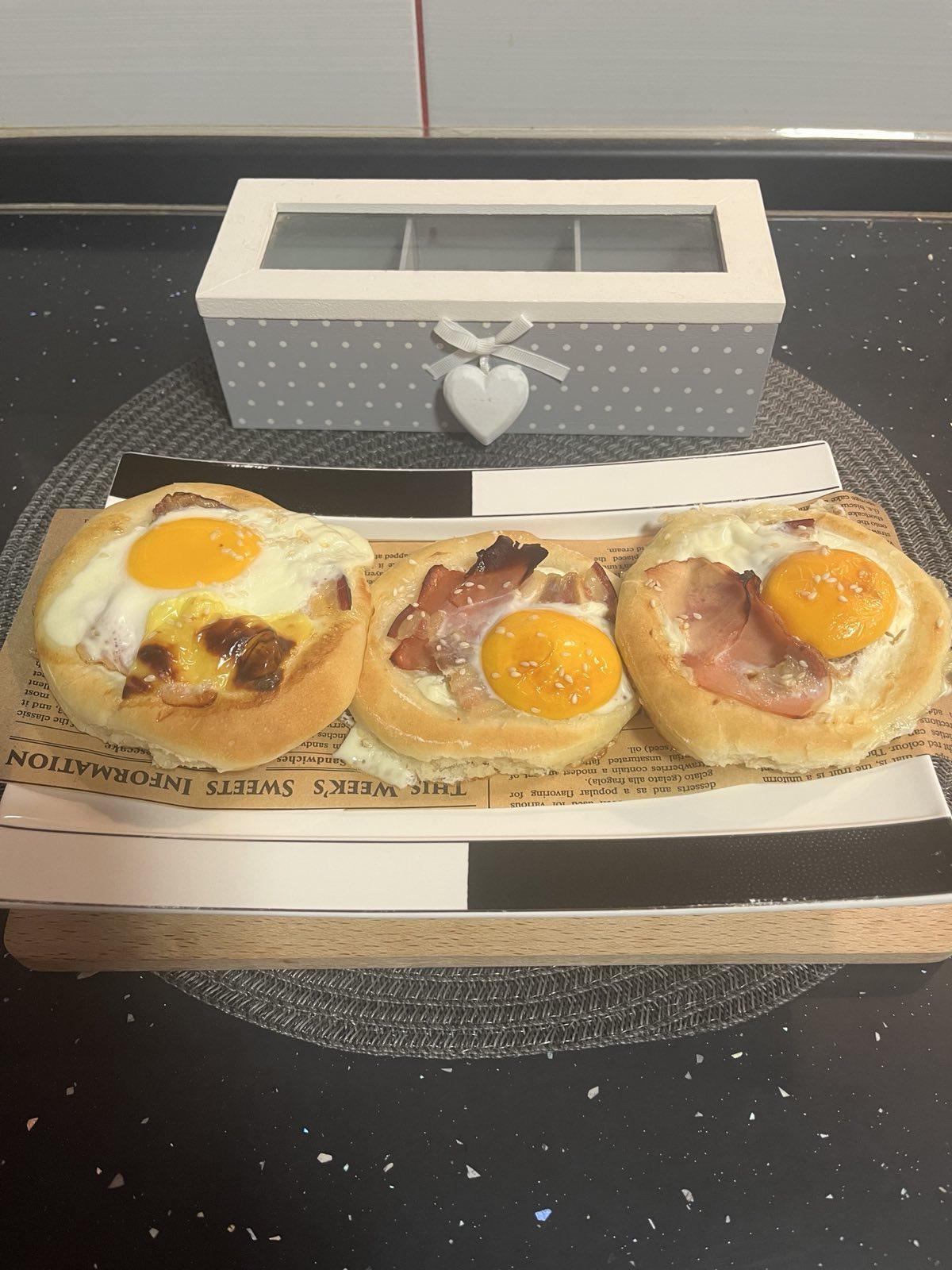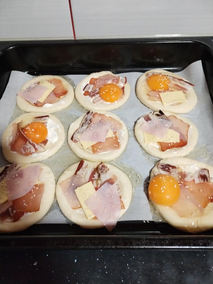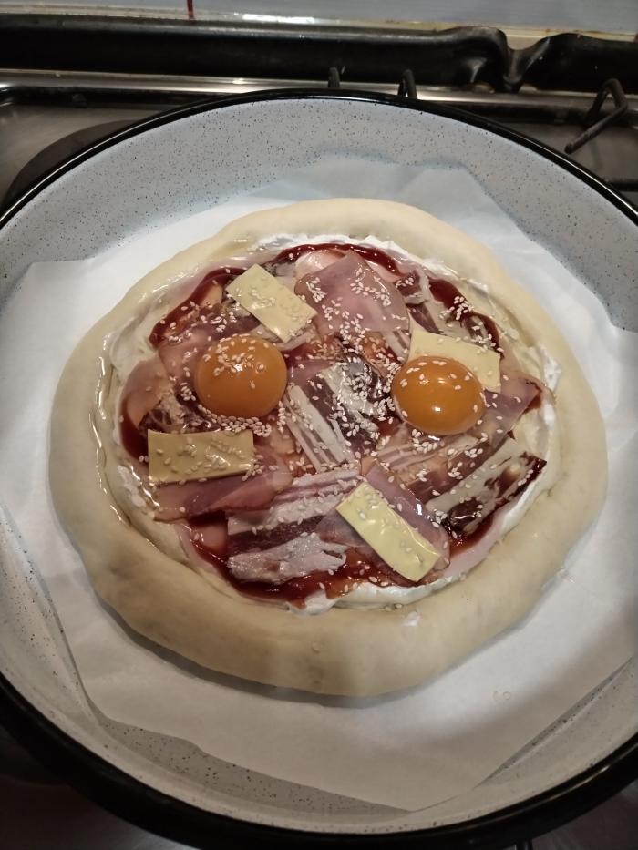 Od preostalog testa oblikujte veći krug (kao pizzu), premažite pavlakom, napunite pančetom, pečenicom i jajetom pa i nju ispecite.