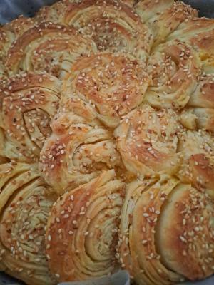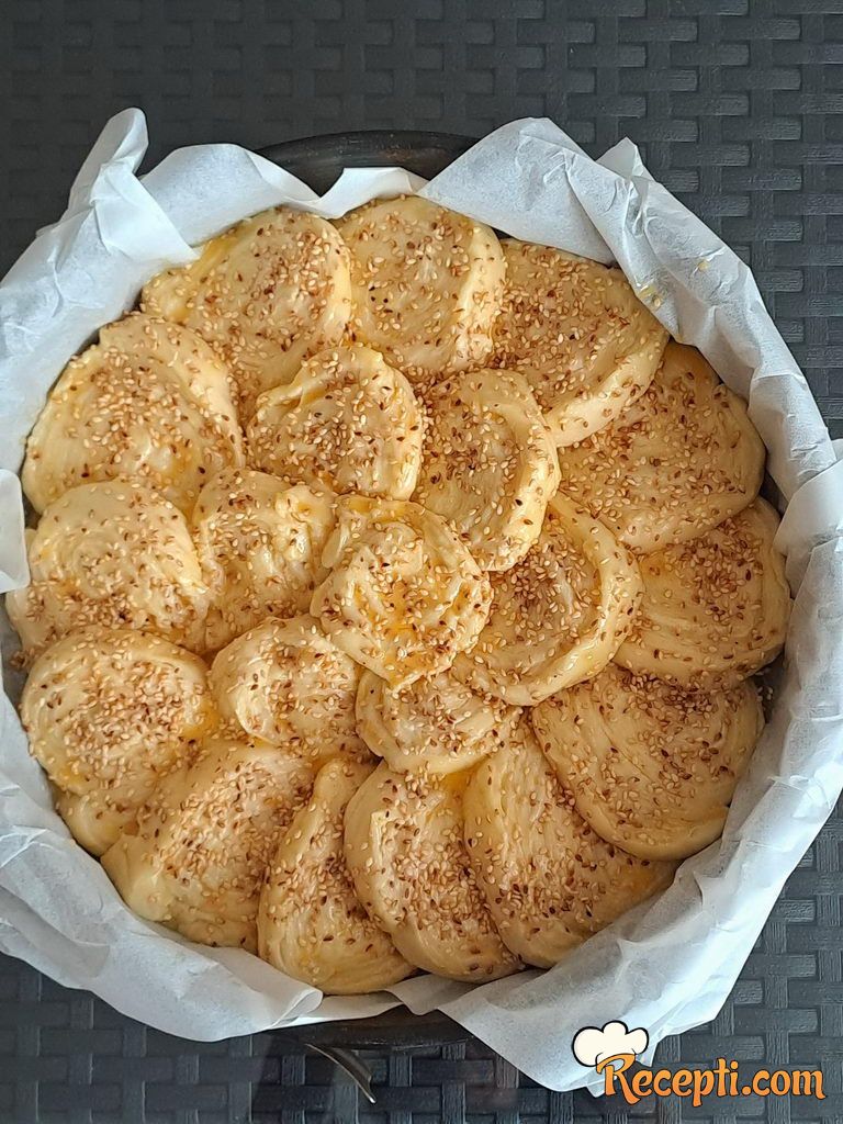 Testo rastanjiti u pravougaonu ploču, pa premazati trećinom margarina i urolati. Pokriti krpom i ostaviti 5 minuta. Zatim istanjiti ponovo u pravougaonu ploču, pa opet premazati margarinom i rolati. Pokriti i ostaviti 5 minuta, a zatim još jednom ponoviti postupak. Sada ne čekati vreme, već rolat izdužiti i iseći na dvadesetak delova, pa i poređati u okruglu tepsiju preklapajući ih delimično jedan preko drugog. Pokriti krpom i ostaviti na toplom oko pola sata. Premazati mešavinom žumanca, mleka i maslinovog ulja, posuti susamom, pa peći oko 35 minuta na 175 stepeni. Pečeno kratko staviti na rešetku i malo prohladiti, a zatim toplo poslužiti.