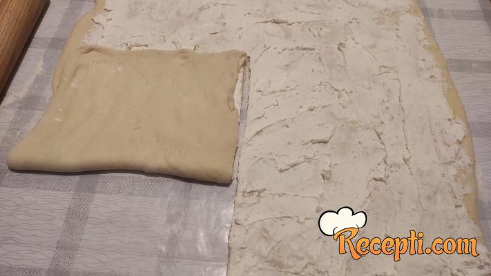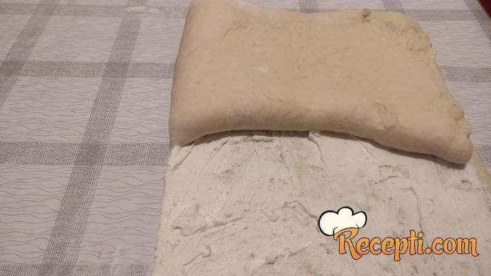 Kada je testo duplirano izručiti ga na radnu površinu i rastanjiti. Sir sjediniti sa kajmakom, pa premazati testo. Nakon toga testo podeliti na pola, pa ga preklopiti 3 puta od sebe ka vrhu.