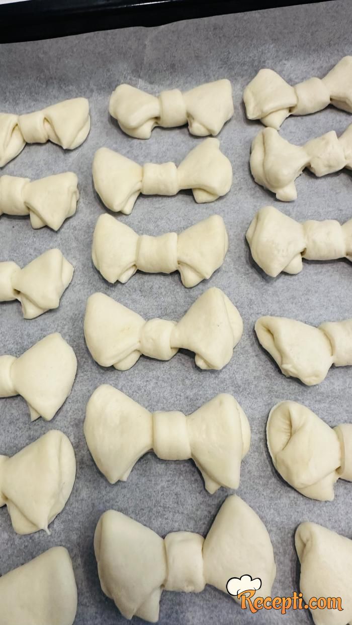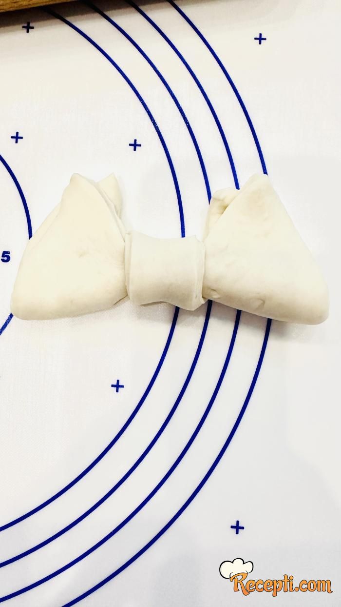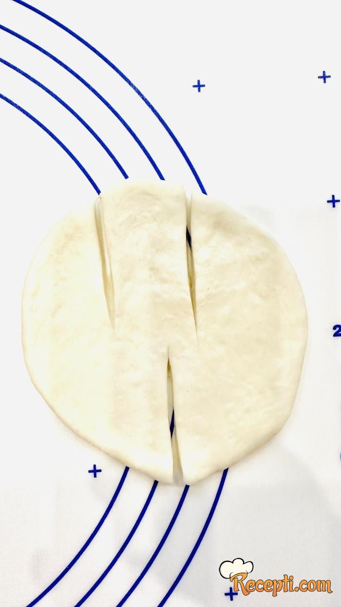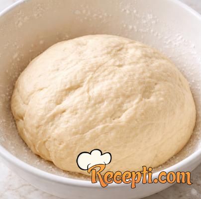 U većoj posudi pomiješati brašno, so i prašak za pecivo. Dodati suhi kvasac i šećer, pa sve kratko promiješati. Dodati toplu vodu i ulje, pa zamijesiti glatko, mekano tijesto. Ostaviti da nadođe.