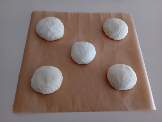 Kvasac usuti u mlaku vodu, dodati šećer, 1 kašičicu brašna, izmešati i ostaviti da odstoji 5 minuta. U dublju posudu usuti 200 g brašna, dodati so i izmešati. Zatim dodati ulje, mlako mleko, nadošli kvasac, izmešati, pa postepeno dodavati brašno i zamesiti mekše testo. Prekriti providnom prijanjajućom folijom i ostaviti da nadođe. Nadošlo testo izručiti na pobrašnjenu radnu površinu, podeliti na 5 delova i od svakog dela testa oblikovati jufkice. Pek-papir staviti na sto. Preko pek-papira poređati jufkice, prekriti ih kuhinjskom krpom i ostaviti da odstoje 5 minuta.