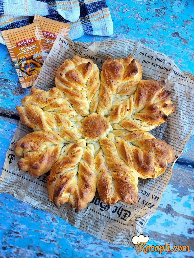 Ostaviti pogaču da kratko narasta dok se rerna zagreva na 180 °C. Pre pečenja premazati umućenim belancetom i peći oko 25 minuta, dok ne porumeni.