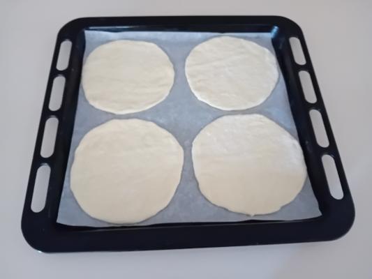 Pleh od električnog šporeta obložiti papirom za pečenje i poređati razvijeno testo. Prekriti kuhinjskom krpom i ostaviti da odstoji 10 minuta. Za to vreme zagrejati rernu na 250 stepeni. Staviti pleh u rernu i lepinje peći 5-7 minuta. Na isti način ispeći i ostale lepinje.