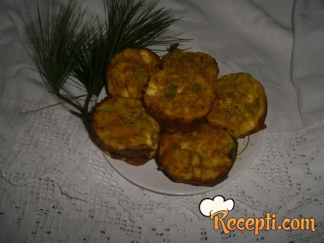 Izmešajte krompir sa jajima i uljem. Dodajte brašno, sitni sir, so, biber začine, prašak za pecivo dobro izmešajte i po potrebi razredite sa malo mleka. Ovu smesu ravnomerno rasporedite u kalupe za mafine. Pecite u rerni zagrejanoj na 200°C oko 20 minuta, ili dok mafini ne dobiju lepu zlatno žutu boju.