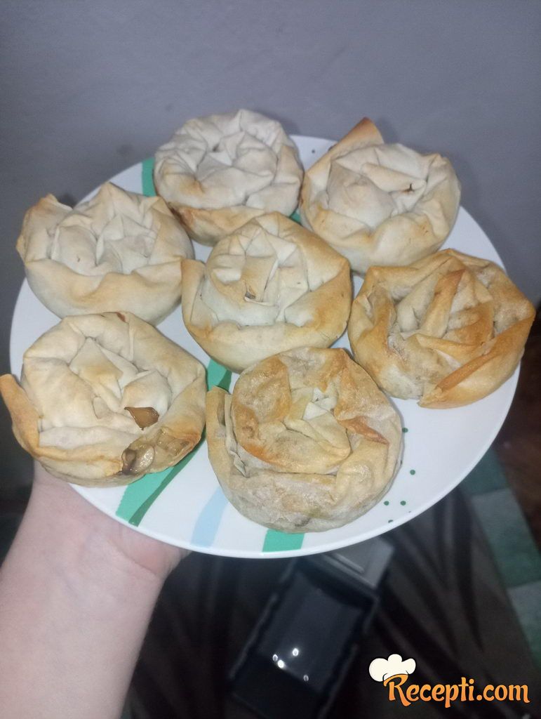 Praziluk iseckati na sitne kockice. Iseckati i pečurke na kockice. Staviti luk da se prži, dodati pečurke. Dinstati deset minuta, odnosno dok ne ispari voda. Dodati začine, promešati, dinstati još 2-3 minuta i skloniti sa ringle. Kore preseći po dužini na dva dela. Staviti fil na početak kore, urolati, i saviti u krug. Peći na 200°C dok ne porumeni.