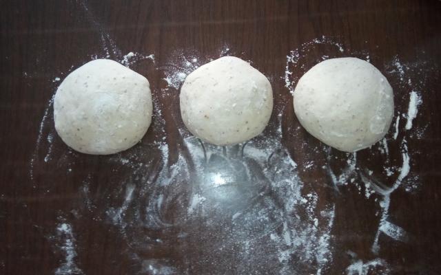 Naraslo testo podelite na tri dela, oblikujte loptice, malo pospite brašna preko loptica, prekrijte krpom i ostavite da testo odmori, dok otopite margarin ili maslac.