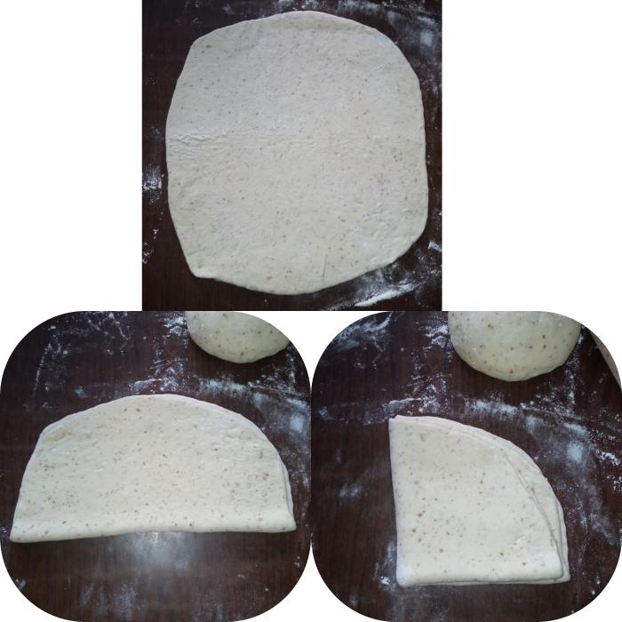 Uzeti prvu lopticu testa i razviti u krug prečnika oko 20 cm, pospite je brašnom, preklopite na pola (odozgo prema gore) zatim pospite još malo brašna i preklopite sa leve na desnu stranu. Tako preklopljeno ostaviti sa strane. Ponoviti postupak i sa preostale dve loptice.