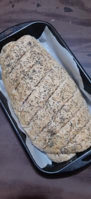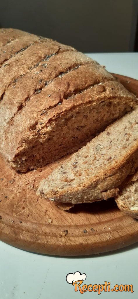 Hleb zarežite ukoso oštrim nožem na nekoliko mesta, premažite maslinovim uljem i ako želite pospite čia semenkama.