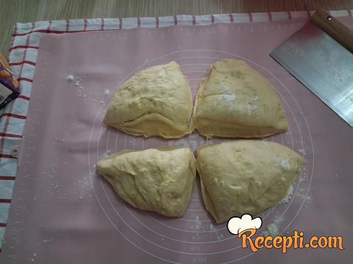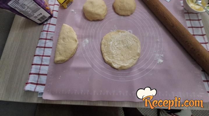 Loptice oklagijom rastanjiti na krugove debljine oko santimetra i premazati otopljenim margarinom i preklopiti na pola. Složiti ih u tepsiju za pečenje u ostaviti 20 minuta da odmore.