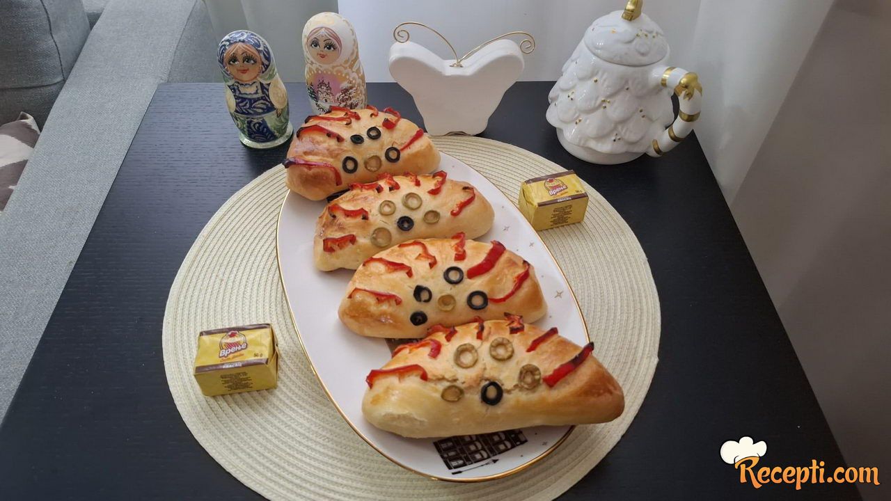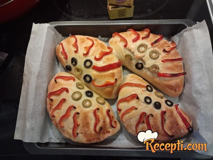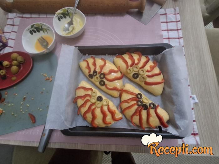 Narasle zemičke nožem zaseći na osmine i premazati umućenim žumancem sa malo mleka. Iseckati papriku i masline.