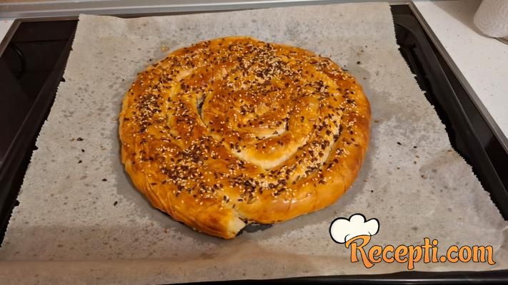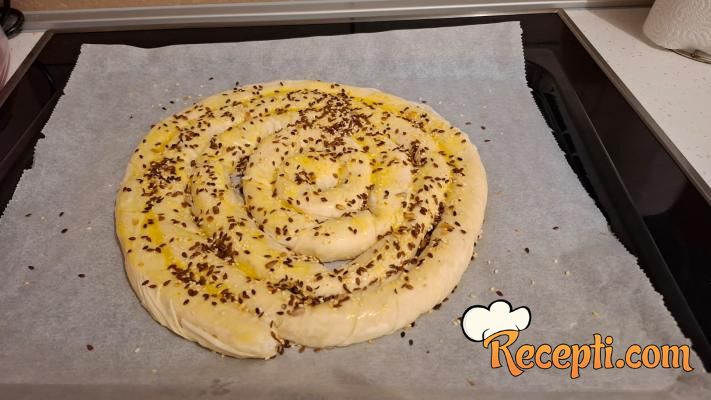 Kada se rerna zagreje na 220 stepeni, pitu premazati razmućenim žumancem sa malo mleka i posuti semenkama.