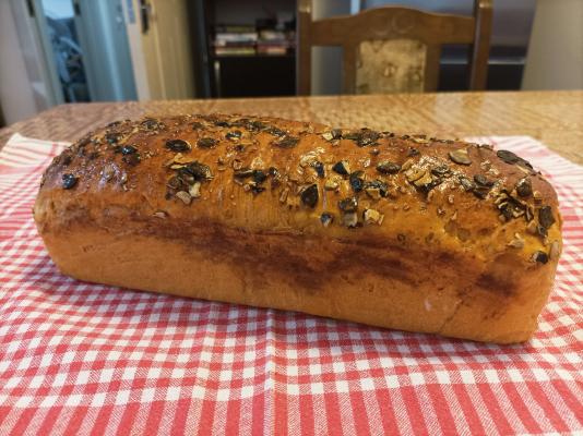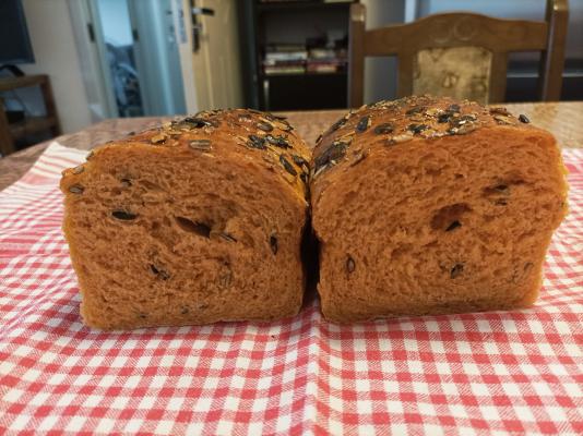 Kalup za hleb veličine 30x12x8 cm obložiti pek papirom i ostaviti na stranu. Naraslo testo prebaciti na pobrašnjenu podlogu, posuti ga brašnom i razviti u koru u dužini pleha u kome će se peći i debljine oko 3-4 mm. Koru posuti jednim delom iseckanih semenki i čvrsto zaviti u rolat. Rolat prebaciti u pripremljeni pleh koji se prekrije kuhinjskom krpom i ostaviti da hleb naraste, da dođe do vrha kalupa.