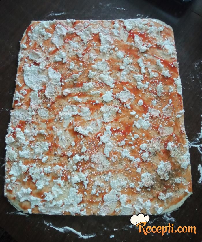 Naraslo testo razvući na 1 cm debljine, na pobrašnjenoj podlozi. Testo premazati umućenim belancetom. Preko premazati kečap i posuti bosiljak. Posuti sir i blago utapkati sir u testo.
