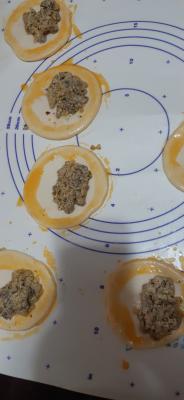 Na polovinu svakog kruga stavite po par kašičica nadeva. Ivice premažite umućenim žumancetom sa vodom.