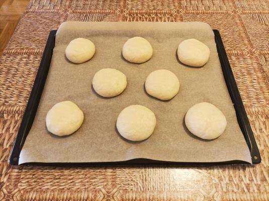 Veliki pleh od električnog šporeta obložiti pek papirom i ostaviti na stranu. Kada je testo stiglo, pesnicom ga pritisnuti po sredini do dna testa, da izađe suvišan vazduh i prebaciti ga na radnu površinu (bez brašna...). testo podeliti na 8 jednakih delova, svaki deo je težine 115 g. Zatim, svaki deo oblikovati u lopticu, tako da površina bude zategnuta. Loptice testa poređati u pripremljeni pleh i svaku blago pritisnuti po površini dlanom ruke da se malo spljošte. Pokriti lepinjice i ostaviti da narastu 50 minuta.