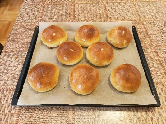 Rernu uključiti da se zagreje na 190 stepeni. Narasle zemičke premazati mešavinom umućenog jajeta i mleka i staviti da se peču oko 15-18 minuta, dok ne dobiju lepu zlatnu boju. Pečene zemičke, čim se izvade iz rerne, lagano premazati sa malo otopljenog maslaca, prekriti ih kuhinjskom krpom (da vam se krpa ne bi umastila, prvo stavite preko zemički kuhinjski ubrus, pa krpu) i ostaviti 10 minuta pre upotrebe.