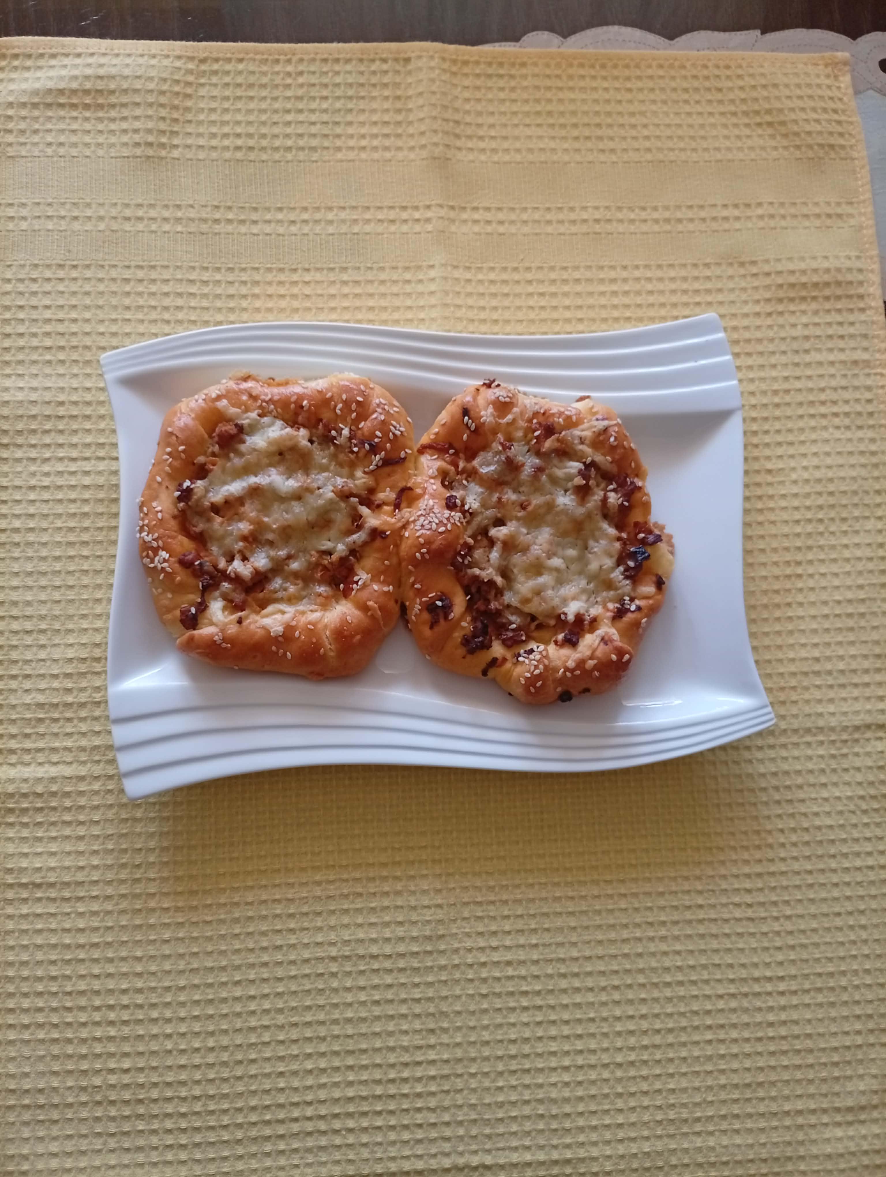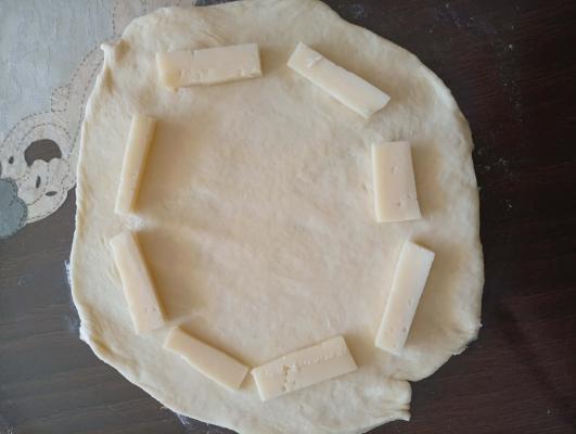 Kačkavalj iseći na manje štapiće i ređati ih na testo u krug.