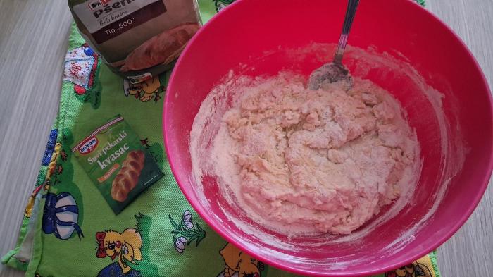 Dodati ostatak brašna i zamesiti glatko testo. Ostaviti pola sata da naraste.