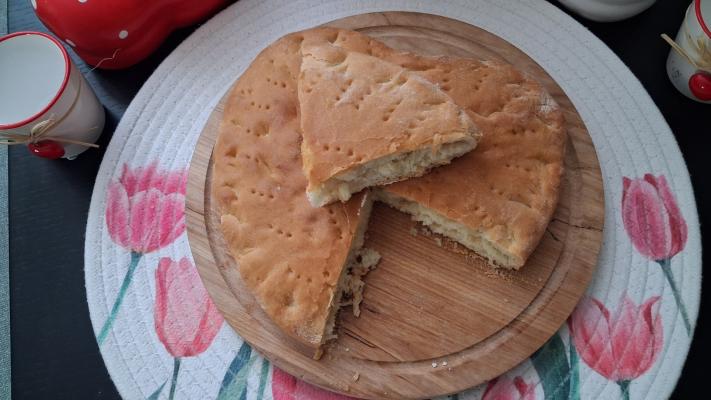 Naraslo testo premesiti i rastanjiti u kalupu za pečenje. Po obodu pogače utisnuti ivicu sa dva savijena prsta, a viljuškom izbockati šare po celoj površini. Ostaviti oko 15 minuta da malo naraste.