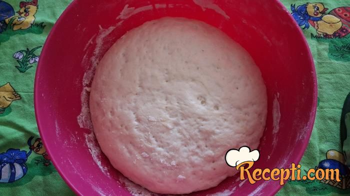 Kada se aktivira, dodati ulje, malo soli, kesicu vanilin šećera i malo brašna. Izmešati pa prebaciti u dublju posudu u kojoj je ostatak brašna. Umesiti testo i ostaviti da narasta od pola sata do sat vremena.