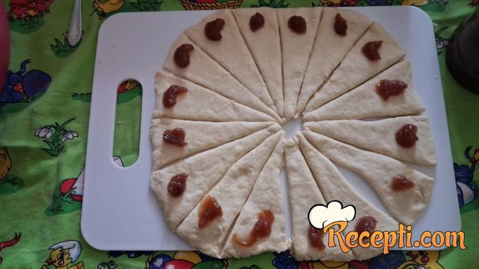 Naraslo testo podeliti na dva dela i svaki od njih rastanjiti u krug i iseći na po 16 trouglova. Na trouglove stavljati po pola kašičice džema.