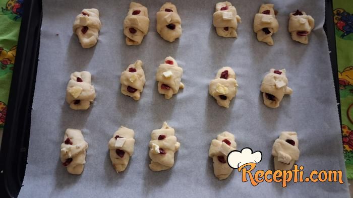 Saviti kiflice i na svaku staviti po dve brusnice i kockicu margarina.