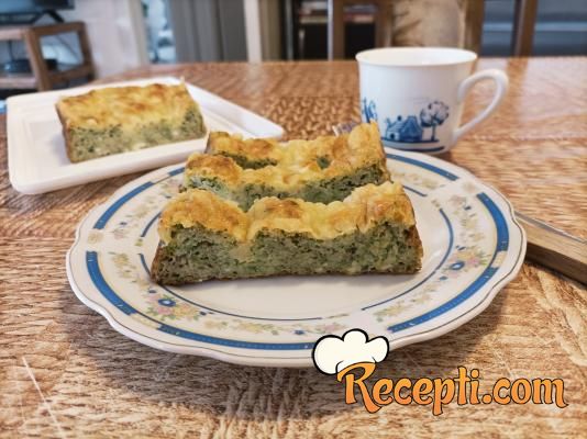 Manji pleh veličine 23 cm x 13 cm x 5 cm obložiti pek papirom i papir samo malo premazati uljem. Rernu zagrejati na 180 stepeni. Oceđeni brokoli staviti u odgovarajuću dublju posudu i viljuškom ga izgnječiti. Posebno umuti viljuškom jaja, dodati kiselu pavlaku, umutiti sve zajedno i dodati u posudu sa brokolijem. Sjediniti viljuškom. Ubaciti polovinu narendanog kačkavalja i promešati. Posoliti i pobiberiti po ukusu i još jedanput sve promešati. Smesu sipati u pripremljeni pleh, poravnati površinu i posuti sa ostatkom kačkavalja. Staviti da se peče oko 25 minuta. Pečenu pitu malo prohladiti, izvaditi iz pleha, prebaciti na odgovarajuću tacnu pa je iseći.
