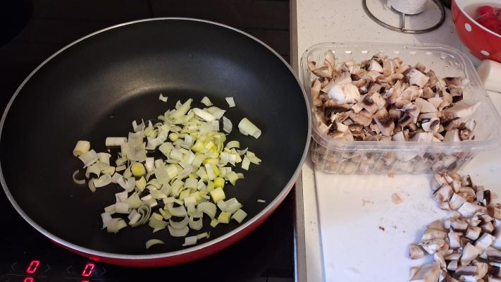Na ulju propržiti naseckan manji praziluk dok ne omekša.