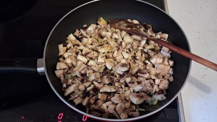 Dodati isečene pečurke i začine. Dobro promešati i pržiti na srednjoj temperaturi, poklopljeno dok pečurke ne ispuste sok. Tada skloniti poklopac i uz povremeno mešanje ostaviti da se dinsta dok sav sok ne uvri.