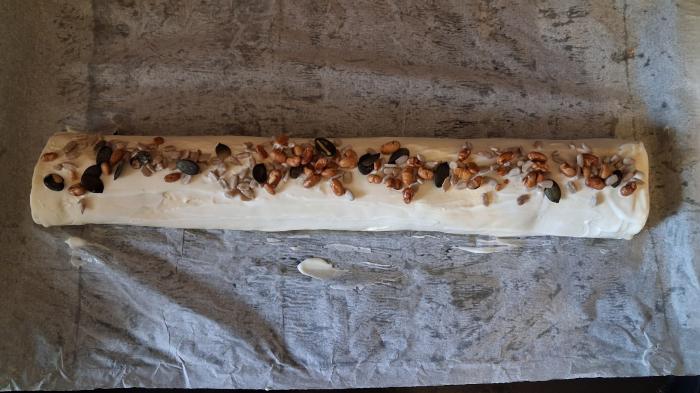 Saviti bočne ivice testa i zarolati pitu. Premazati rolnu posnim majonezom i po vrhu posuti mešavinom zrnevlja po izboru (koristila sam mešavinu za obrok salatu).